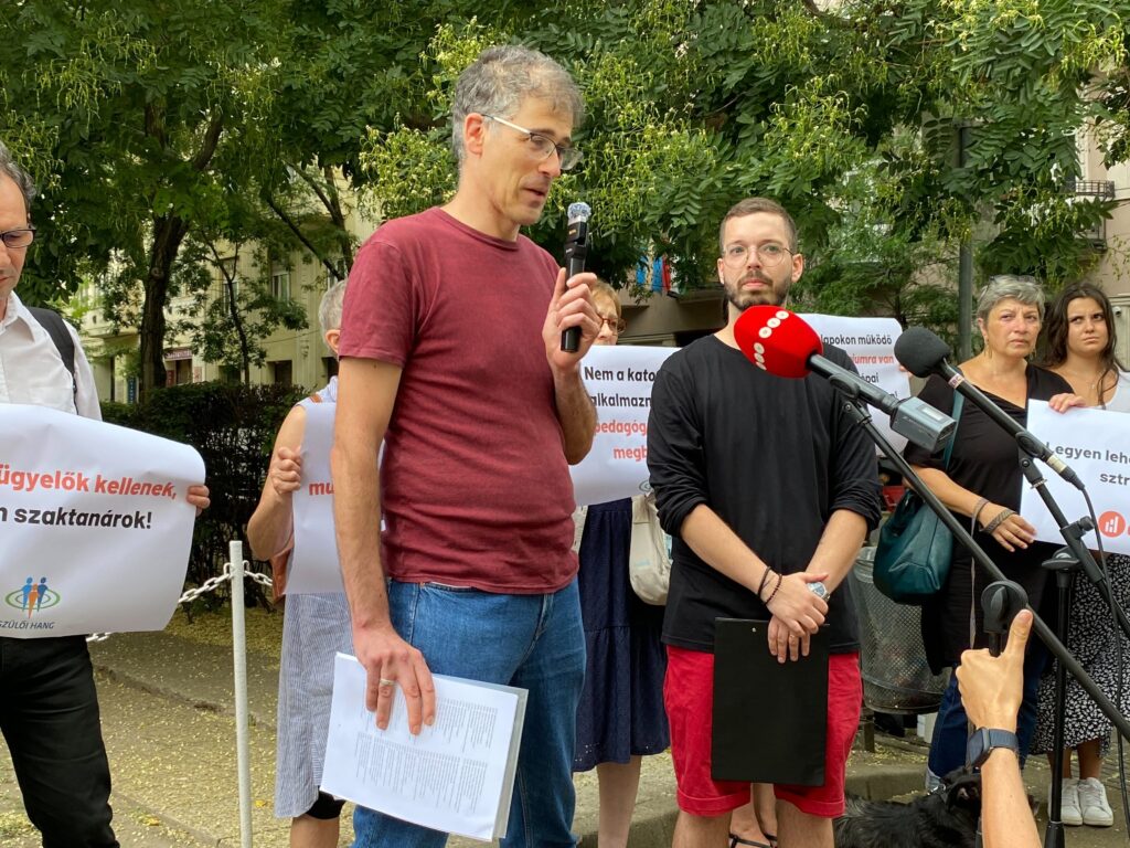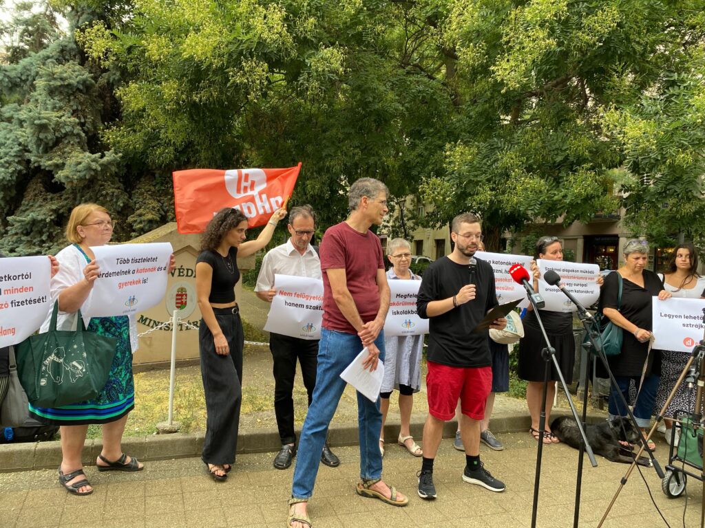 A Honvédelmi Minisztériumhoz érve aktivistáink különböző transzparensekkel hívták fel a figyelmet arra, hogy a katonák iskolába vezénylése helyett mivel lehetne javítani az oktatás helyzetén. A Szülői Hanggal közösen több mint 20 ezer tiltakozó aláírást vittünk el, majd egy sajtótájékoztatón elmondtuk, elfogadhatatlannak tartjuk ezt a jogszabályt, amelynek ráadásul a részletei a mai napig – kevesebb mint egy hónappal az iskolakezdést megelőzően – nem ismertek. A sajtótájékoztató ide kattintvanézhető vissza.
