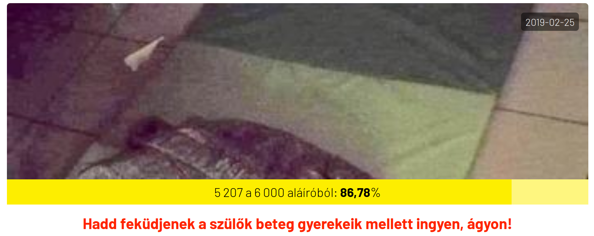 - Magyar Anyák, akik azért indítottak kampányt, hogy a kórházakban látogató szülők normális körülmények között és ingyen tölthessék az éjszakát beteg gyermekeik mellett.