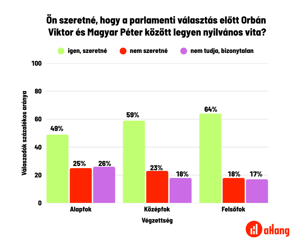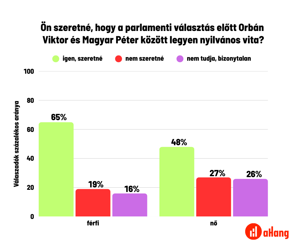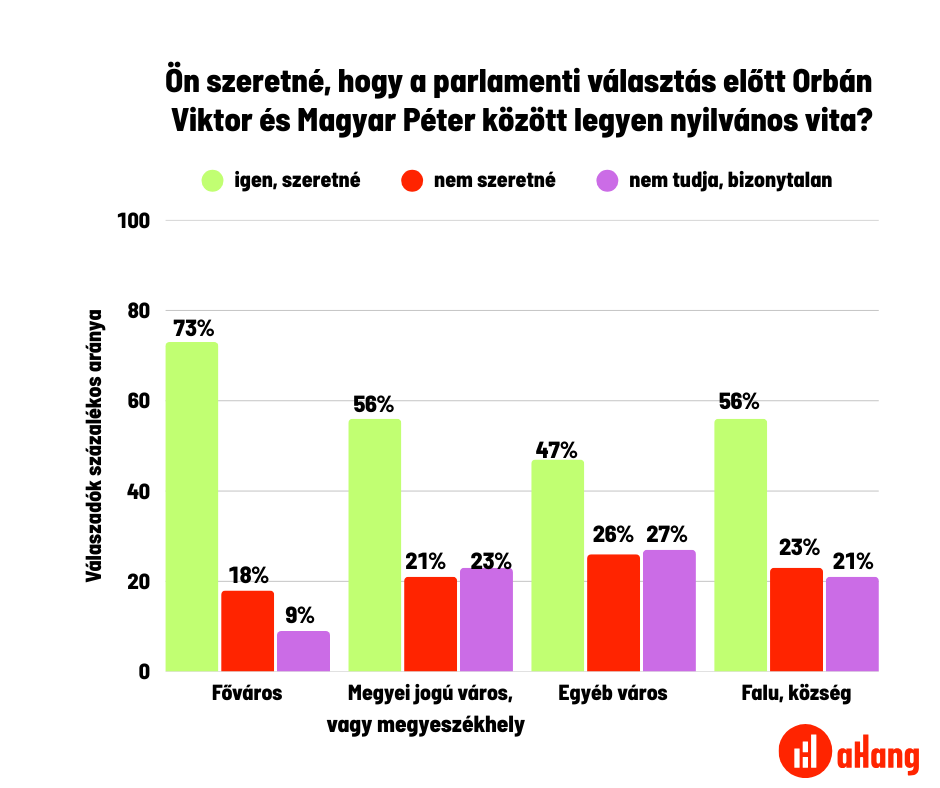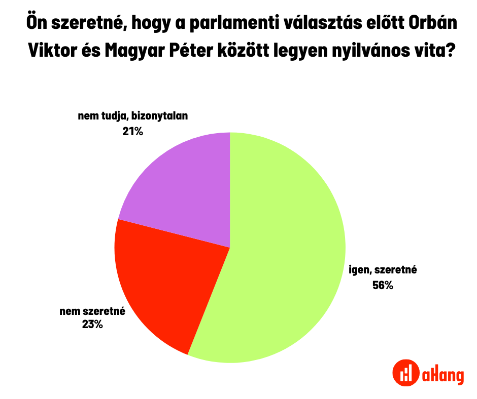 Az aHang megbízásából a 21 Kutatóközpont augusztus végén végzett közvélemény-kutatást, amelyben a miniszterelnök-jelölti vitára is rákérdeztek*. Az eredmények világosan mutatják, hogy a magyar társadalom többsége támogatja a vitát: a teljes népesség 56 százaléka szeretne vitát Orbán és Magyar között, miközben mindössze 23 százalék utasította el ezt, és 21 százalék volt bizonytalan.