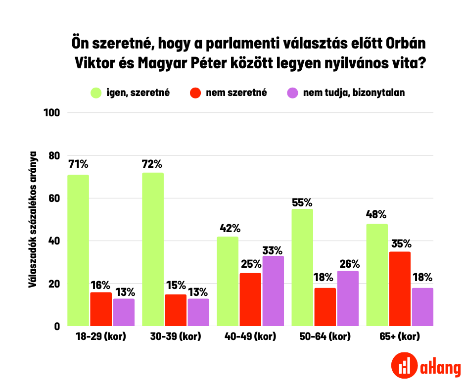 A korosztályos adatok szintén erős üzenetet hordoznak. A 18–29 évesek 71 százaléka és a 30–39 évesek 72 százaléka támogatja a vitát, vagyis éppen azok a fiatalabb generációk szeretnék leginkább a megmérettetést, akik szinte soha életükben nem láthattak miniszterelnök-jelölti vitát. A középkorúak között alacsonyabb a támogatás, de még a 40–49 évesek közül is közel minden második ember szeretné a vitát. Az 50-64 évesek több mint fele, 55%, míg az idősebbeknél, a 65 év felettieknél közel a fele, 48 százalék áll ki mellette.